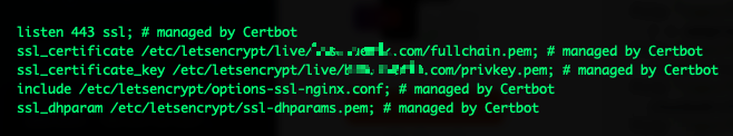 아무튼 대충 읽어보면 알수 있는 내용이다. 중요한건 설치다. 아. 그리고 엔진엑스 설정파일은 하나 만들어놓고 복사해서 쓰는 경우가 태반이기도 하다. 혹시 기존에 인증서가 존재한다면 다시 재설정여부를 물어보기는 하는데 기존사용된 인증서 없이 곧바로 아래와 같은 내용이 있다면 지워주고 실행하는게 좋다. 이 영역은 certbot 에서 자동으로 설정해주는 영역이기 때문이다.