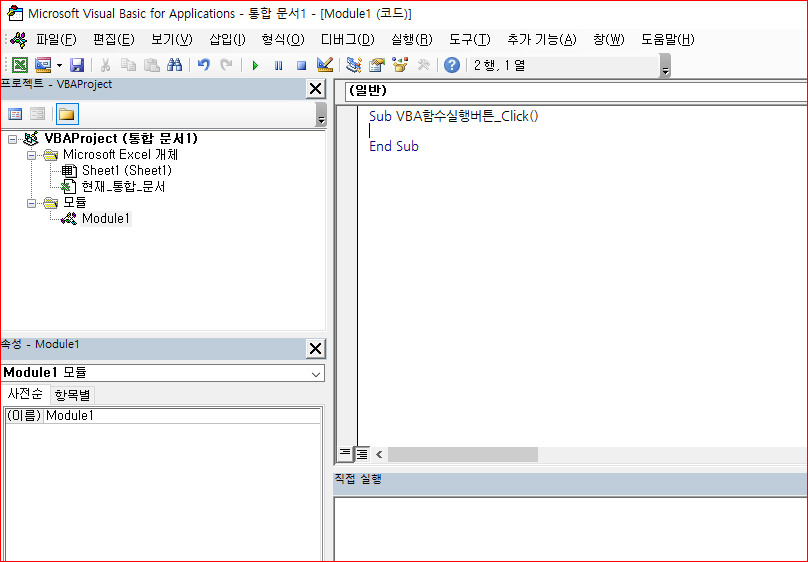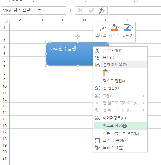 여기서 좌측 위에 VBA 함수실행 버튼 이라 객체에 이름을