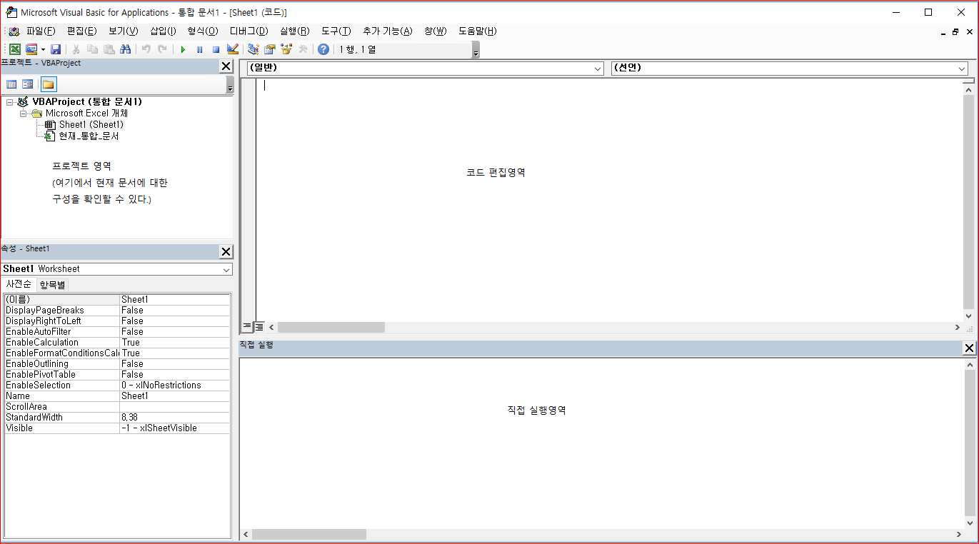 하지만 처음에 하단에 보이는 "직접 실행" 창이 없을 것이다. 우리가 일반적으로 개발할때 보는 콘솔이나 로그 등을