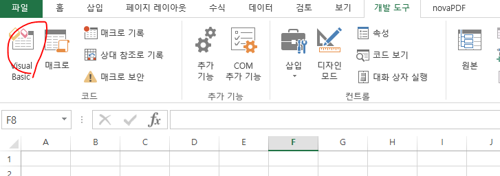 이제 Excel 메뉴 영역에서 Visual Basic 를 클릭하여 편집기를 활성화 한다.