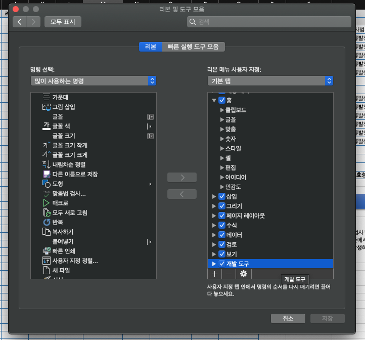 맥 (Mac OSX) 오피스에서는 (Command + ,) 키를 누르고 Excel 기본 설정을 활성화 시킨다.