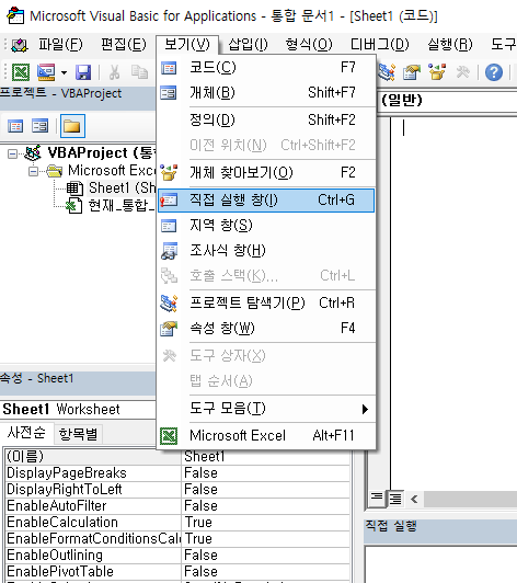 확인하려면 "직접 실행" 창을 활성화 시켜야 한다.