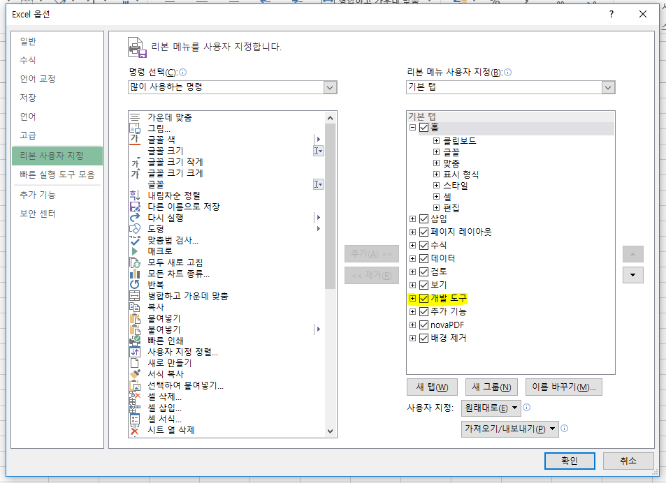 먼저 운영체제 윈도우에서 실행하는 엑셀에서는 다음 처럼 "개발도구" 를 활성화 시킨다.