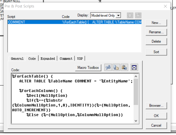Menu > Database > Pre & Post Scripts > Model Level