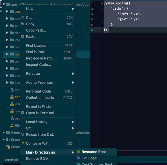 Jetbrain 제품군 (WebStorm, IntelliJ, PHPStorm 등등)에서 Nuxt.js 및 Vue.js 어플리케이션을 개발할때 "@/" 및 "~/" 문자열로 경로 자동완성(intellisense)을 지원하지 않는다. 이에 다음과 같은 형태로 처리(?) 로 가능하다. Visual Studio Code 에서는 jsconfig.json 으로 path 에 대한 alias 를 설정할 수가 있으나 익숙해진 WebStorm 인터페이스를 고집하기 위해 구글링 ㄱㄱ