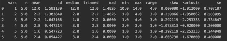 먼저 R 의 describe() 함수 결과를 파이썬에서 출력해보자.