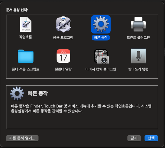 2. 신규문서를 생성하여 문서유형이 "빠른 동작" 을 선택한다.