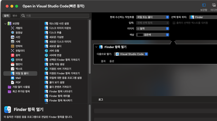 파인더에서 VSCode 로 폴더나 파일을 열려는데, 따로 없어서 불편했는데 Automator 를 이용하면 간단하게 해결할 수 있었다.