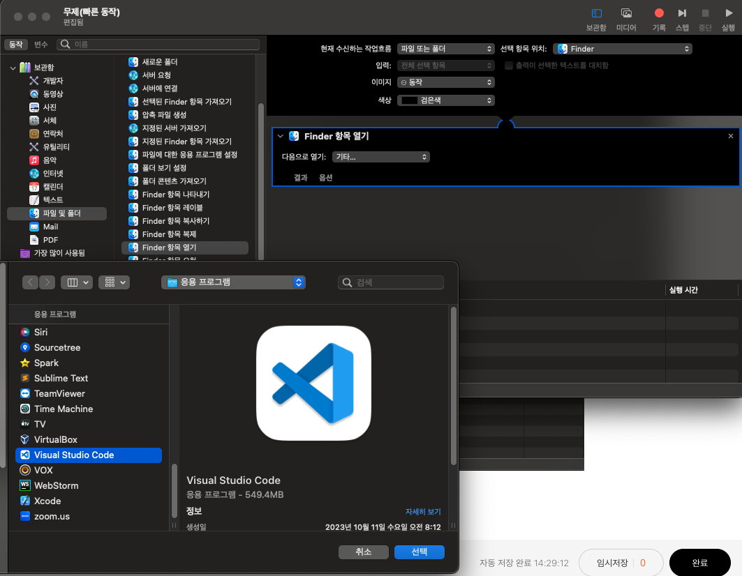 파인더에서 VSCode 로 폴더나 파일을 열려는데, 따로 없어서 불편했는데 Automator 를 이용하면 간단하게 해결할 수 있었다.