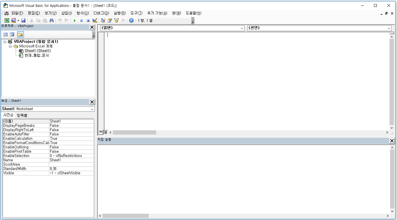 하지만 처음에 하단에 보이는 "직접 실행" 창이 없을 것이다. 우리가 일반적으로 개발할때 보는 콘솔이나 로그 등을