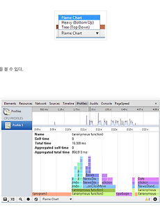 반응형 크롬 개발자 도구1 자바스크립트 CPU프로파일 프레임차트(JavaScript CPU Profile Frame Chart) 원문링크 : http://mixed.tistory.com/218기존 자바스크립트 프로파일링은 어떤 함수가 얼마나 오래 걸렸는지 프로파일링 하기 때문에 소비 시간을 기준으로 느린 함수와 빠른 함수를 확인할 수 있었다.하지만, 어떤 시점에 어떤 함수가 실행되고 얼마나 느린지 확인할 수 없었다.예를 들어, 프로파일링을 실행하고 이벤트들을 수행한 다음 프로파일링을 끝내면 기존에는 프로파일링은 어떤 함수가 느린지 확인할 수 있었다면, 이벤트가 발생한 시점에 어떤 함수가 빠르고 느린지 확인할 수 없었다.이 부분을 최근 크롬 개발자도구에서 프레임차트(Frame Chart)의 기능을 이용하여 시간의 흐름에 따라 함수의 실행시간을 확인할 수 있다.즉, 특정 시점에 어떤 함수가 느린지 확인하고 싶을때 프레임 차트를 사용하.. 2014. 12. 31. 이전 1 다음 반응형